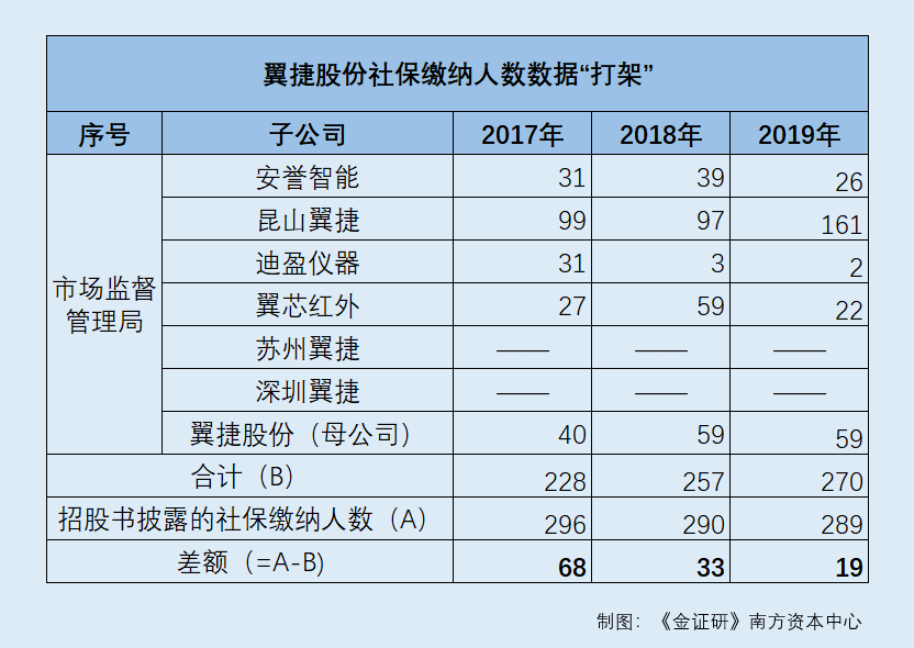 也就是说,2017-2019年,翼捷股份及其子公司的社保缴纳人数合计,应分别为228人、257人、270人。