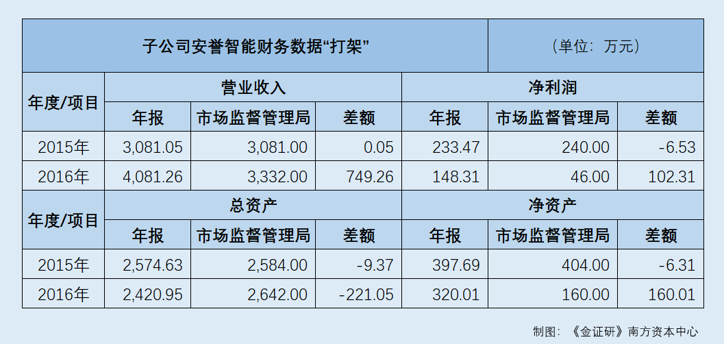 且2016年,相较市场监督管理局披露数据,翼捷股份2016年报披露子公司安誉智能的营业收入多出749.26万元,净利润多出102.31万元,总资产少了221.05万元,净资产多出160.01万元。
