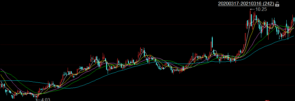 近一年来,TCL科技股价的最低点出现在2020年4月28日,为4.03元/股,随后呈震荡走高的趋势。