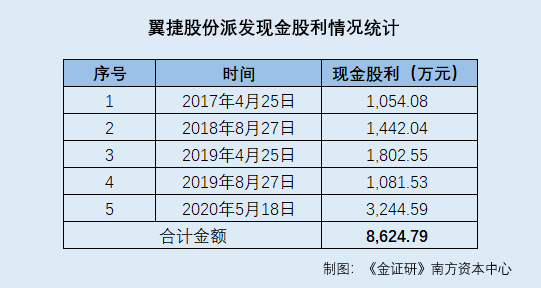 据招股书,2017年4月25日,翼捷股份派发现金股利1,054.08万元;2018年8月27日,翼捷股份派发现金股利1,442.04万元;2019年4月25日,翼捷股份派发现金股利1,802.55万元;2019年8月27日,翼捷股份派发现金股利1,081.53万元;2020年5月18日,翼捷股份派发现金股利3,244.59万元。