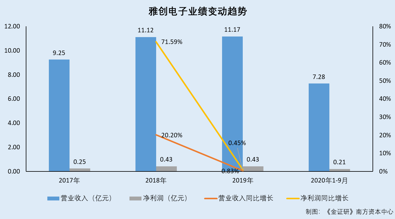 据雅创电子签署日期为2021年1月8日的招股书(以下简称“招股书”),2017-2019年及2020年1-9月,雅创电子的营业收入分别为9.25亿元、11.12亿元、11.17亿元、7.28亿元,2018-2019年,营业收入分别同比增长20.2%、0.45%。