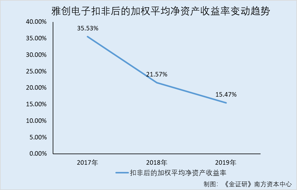 据招股书,2017-2019年,雅创电子扣除非经常性损益后的加权平均净资产收益率分别为35.53%、21.57%、15.47%。