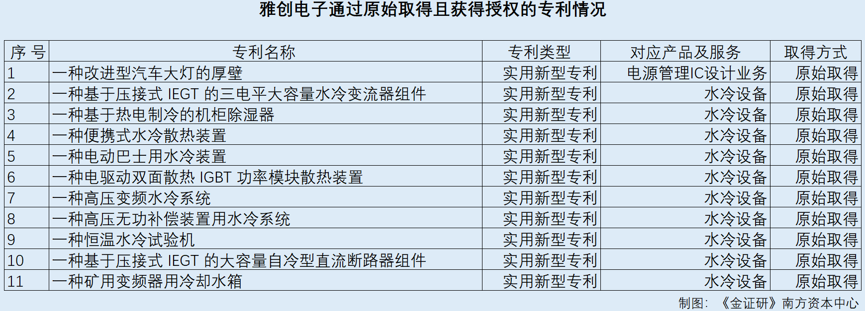 观其获得授权的专利情况,其中,“一种基于压接式IEGT的三电平大容量水冷变流器组件”、“一种基于热电制冷的机柜除湿器”、“一种便携式水冷散热装置”等10项专利均应用于水冷设备,仅1项名为“一种改进型汽车大灯的厚壁”的专利应用于电源管理IC设计业务。