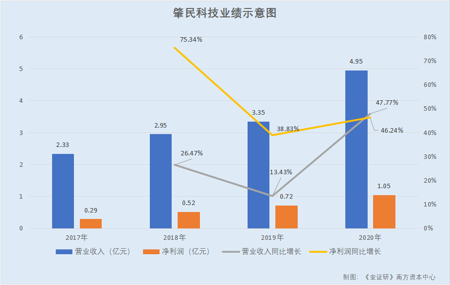 据签署日为2021年3月3日的招股书(以下简称“招股书”),2017-2020年,肇民科技营业收入分别为2.33亿元、2.95亿元、3.35亿元、4.95亿元,2018-2020年分别同比增长26.47%、13.43%、47.77%。