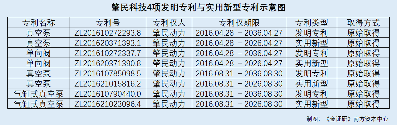 据招股书,肇民科技拥有两项名为“真空泵”的发明专利,专利号分别为ZL201610785098.5、ZL201610272293.8,专利权期限分别为2016年4月28日-2036年4月27日、2016年8月31日-2036年8月30日。
