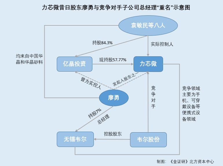 回溯历史,2002年,廖勇与袁敏民等十余人从中国华晶电子集团公司(以下简称“中国华晶”)“出走”,随后廖勇与另外两名股东出资设立无锡力芯微电子股份有限公司(以下简称“力芯微”),十年后廖勇退出力芯微,而袁敏民等十余人仍在力芯微担任要职。