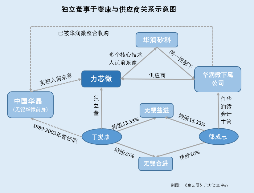 由上述情形可见,力芯微与其供应商无锡华润上华背后股东华润微,或颇有“渊源”,背后现“熟人关系网”。一方面,力芯微的八位实控人及独董于燮康均曾在中国华晶任职,而中国华晶已被华润微收购。另一方面,力芯微的6名核心技术人员,也均来自华润微的控股子公司。此外,力芯微独立董事于燮康与华润微会计主管邬成忠对外持股相同的2家公司,两人系合作伙伴。而供应商背景错综复杂,无锡华润上华及其关联方常年位列力芯微前五供应商,其中的影响几何?尚未可知。