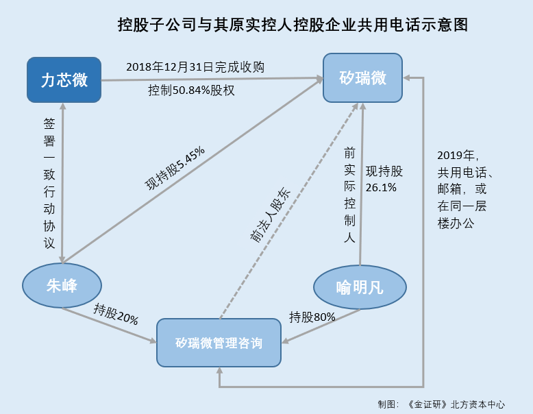 简而言之,2018年底,力芯微收购了矽瑞微50.84%的股权,并对其取得控制权。然而在2019年,矽瑞微仍与原实控人喻明凡控股的企业共用电话和邮箱,且或同一层住所办公。力芯微控股子公司矽瑞微的经营独立性或遭“侵蚀”。