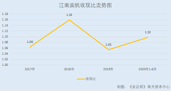 据东方财富Choice公开数据,2017-2019年以及2020年1-6月,江南奕帆经营活动现金流入小计分别为1.62亿元、1.69亿元、1.79亿元、0.87亿元。同期,江南奕帆收现比分别为1.06、1.16、1.05、1.1。