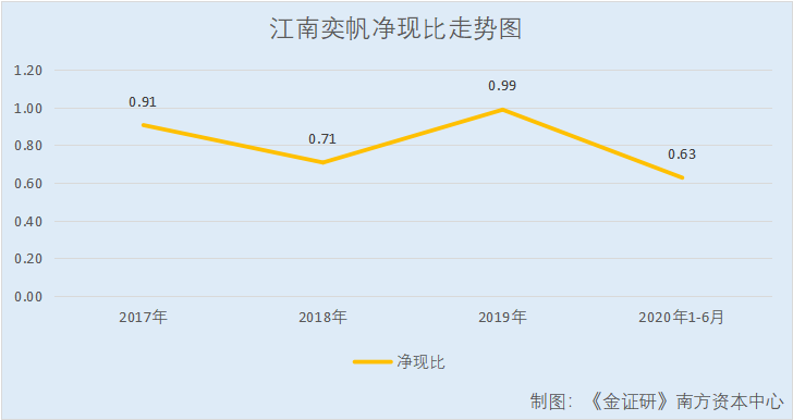 2017-2019年以及2020年1-6月,江南奕帆经营活动产生的现金流量净额分别为5,065.92万元、3,771.99万元、6,242.07万元、1,879.53万元。同期,江南奕帆净现比分别为0.91、0.71、0.99、0.63。