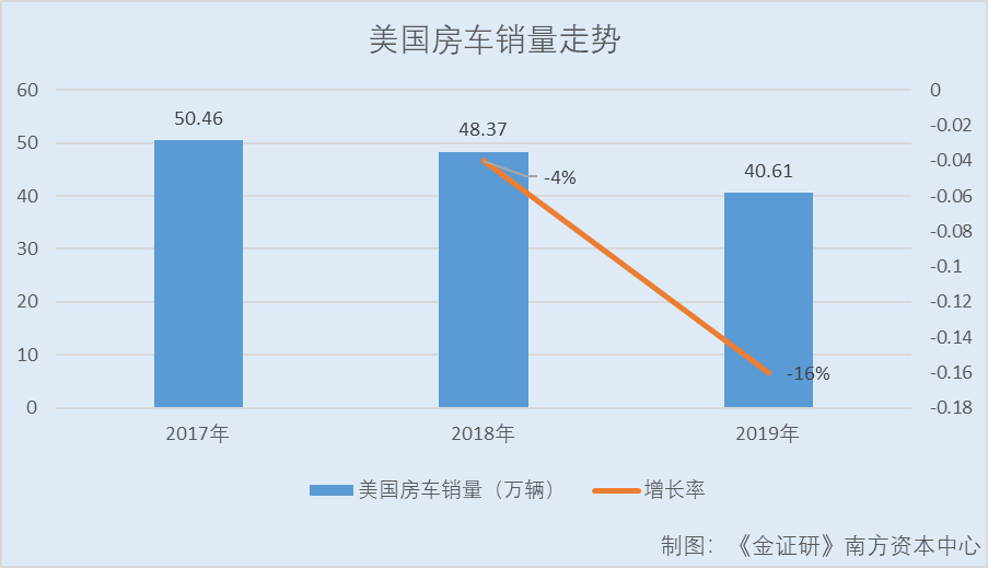 据招股书引援自美国房车工业协会数据,2017-2019年,美国房车销量分别为50.46万辆、48.37万辆、40.61万辆,2018-2019年分别同比增长-4%、-16%。