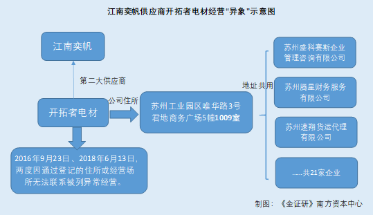 《金证研》南方资本中心研究发现,江南奕帆前五供应商之一的开拓者电材,曾两次因无法联系经营场所,而被列入异常经营名录。且该供应商与包括财务公司腾星财务在内的21家公司或在同一房间内“办公”,其中还惊现财务公司“身影”,江南奕帆与之交易,真实性存疑。
