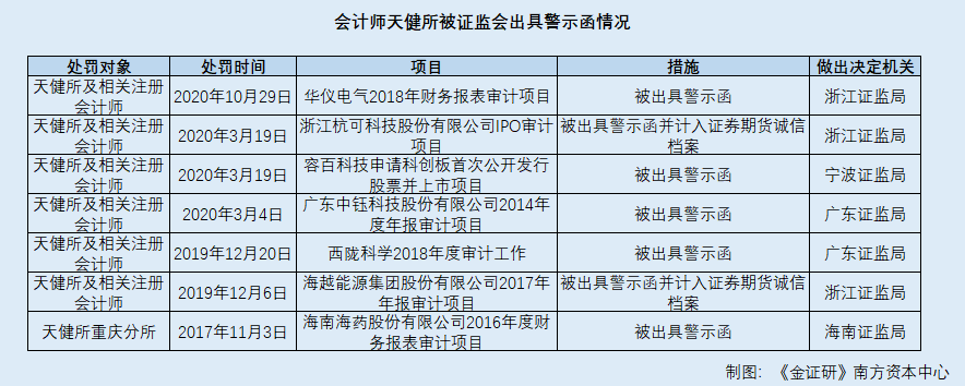 据浙江监管局2020年11月19日发布的《关于对天健所及注册会计师吕瑛群、皇甫滢采取出具警示函措施的决定》,2020年10月29日,天健所及相关注册会计师因在执行华仪电气股份有限公司2018年财务报表审计项目中存在未对银行函证实施有效控制,函证程序执行不到位;未对募集资金专户对账单的异常迹象保持合理怀疑,审计程序不到位的问题,被浙江证监局出具警示函。