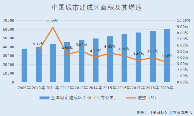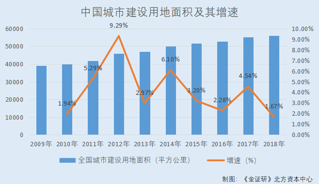 据东方财富Choice数据,2009-2018年,中国城市建设用地面积分别为3.9万平方公里、3.98万平方公里、4.19万平方公里、4.58万平方公里、4.71万平方公里、5万平方公里、5.16万平方公里、5.28万平方公里、5.52万平方公里、5.61万平方公里,2010-2018年分别同比增长1.94%、5.29%、9.29%、2.97%、6.1%、3.2%、2.28%、4.54%、1.67%。