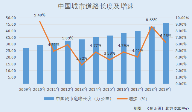 据中国住房和城乡建设部《2019年城市建设统计年鉴》,2009-2019年,中国城市道路长度分别为26.91万公里、29.44万公里、30.89万公里、32.71万公里、33.63万公里、35.23万公里、36.5万公里、38.25万公里、39.78万公里、43.22万公里、45.93万公里。2010-2019年,中国城市道路长度增速分别为9.4%、4.91%、5.89%、2.82%、4.77%、3.59%、4.79%、4.02%、8.65%、6.26%。