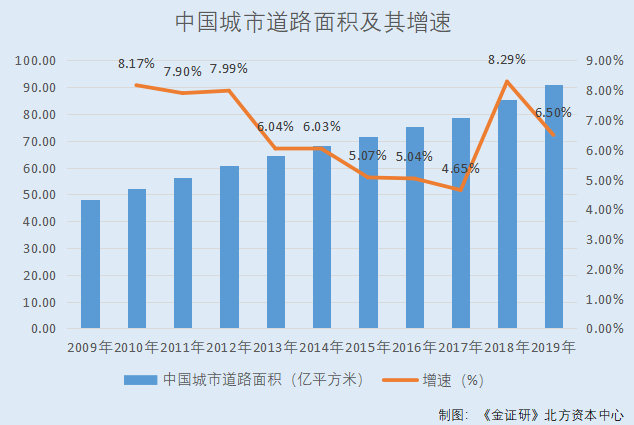 据中国住房和城乡建设部《2019年城市建设统计年鉴》,2009-2019年,中国城市道路面积分别为48.19亿平方米、52.13亿平方米、56.25亿平方米、60.74亿平方米、64.42亿平方米、68.3亿平方米、71.77亿平方米、75.38亿平方米、78.89亿平方米、85.43亿平方米、90.98亿平方米。2010-2019年,中国城市道路面积增速分别为8.17%、7.9%、7.99%、6.04%、6.03%、5.07%、5.04%、4.65%、8.29%、6.5%。