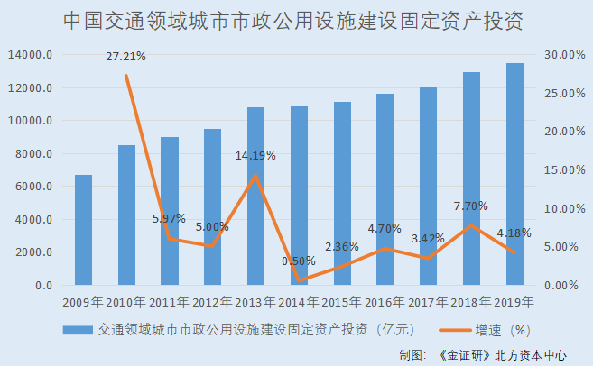 据中国住房和城乡建设部《2019年城市建设统计年鉴》,2009-2019年,中国交通领域(轨道交通及道路桥梁)城市市政公用设施建设固定资产投资额分别为6,688.1亿元、8,508.3亿元、9,016.2亿元、9,467亿元、10,810.7亿元、10,865.1亿元、11,121.2亿元、11,643.8亿元、12,041.9亿元、12,969.3亿元、13,511亿元。2010-2019年,中国交通领域城市市政公用设施建设固定资产投资额增速分别为27.21%、5.97%、5%、14.19%、0.5%、2.36%、4.7%、3.42%、7.7%、4.18%。
