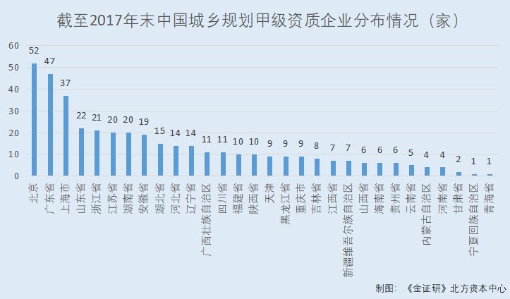 也就是说,截至2017年末,逾五成甲级资质的城乡规划编制单位位于中国东部地区,而广东省拥有甲级资质的城乡规划编制单位数量,高居全国第二。