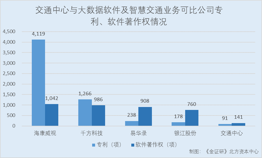 不难看出,2019年交通中心的大数据软件及智慧交通业务对其主营业务贡献收入比重已超三成。然而,该业务相关的专利、软件著作权与同行对比,或显“单薄”。
