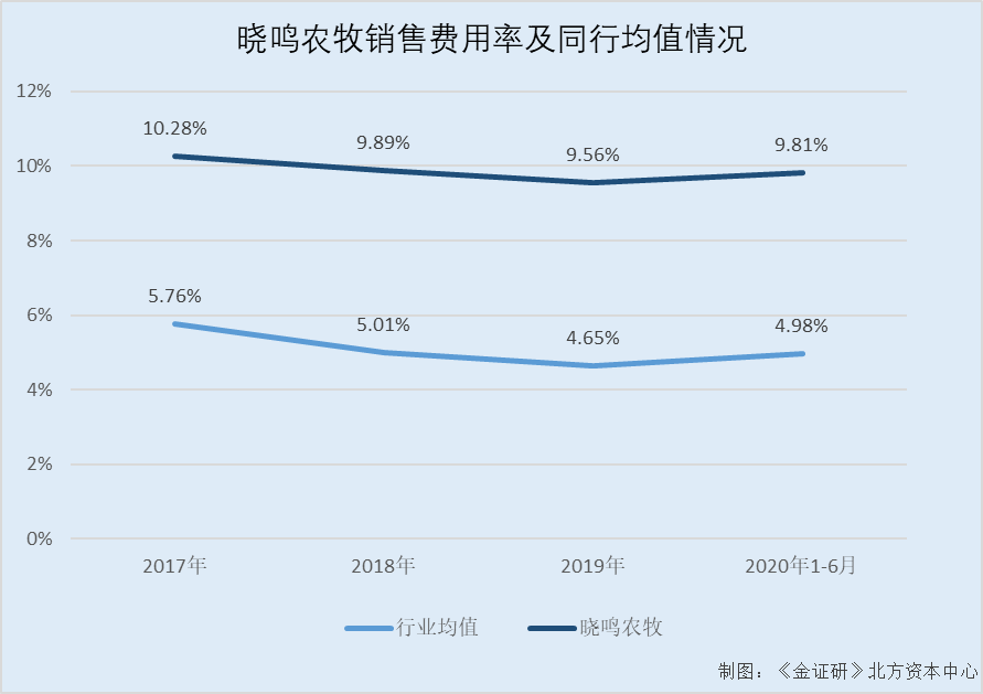 也就是说,报告期内,晓鸣股份的销售费用率较行业均值皆高出超4%。