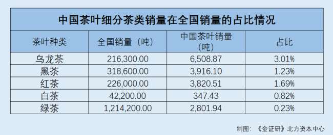根据《金证研》北方资本中心统计分析,若市场占有率以销量表示,即2019年,中国茶叶乌龙茶、黑茶、红茶、白茶、绿茶的销量占全国同类茶叶销量的比例或分别为3.01%、1.23%、1.69%、0.82%、0.23%。