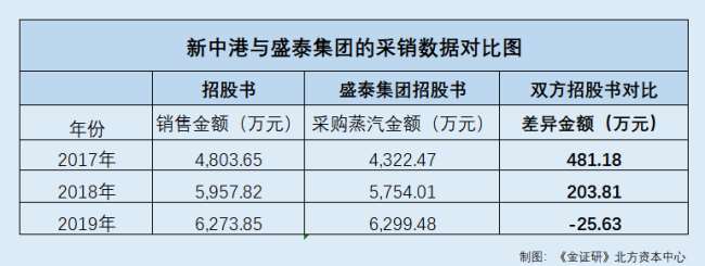 据《金证研》北方资本中心研究,2017-2019年,新中港披露其对盛泰集团的销售额,比盛泰集团披露的同期采购金额分别多481.18万元、多203.81万元、少25.63万元。