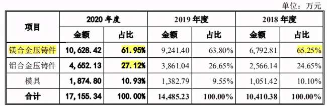 其中,镁合金、铝合金精密压铸件收入平均占比为89.81%,主要产品应用于汽车(包括传统汽车及新能源汽车)、电动自行车以及园林机械工具等领域。报告期内,汽车类压铸件占比均在70%以上,公司60%以上主营业务收入来源于镁合金精密压铸件。