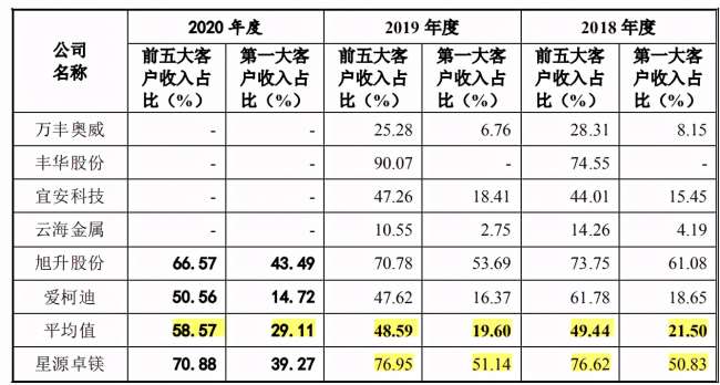 2018年-2020年,星源卓镁前五大客户收入占比分别为76.62%、76.95%和70.88%,客户集中度较高,其中对第一大客户Sea Link International IRB, Inc.的销售收入占营业收入比例分别为50.83%、51.14%、39.27%,占比较高;同时2020年,Sea Link向公司的采购金额约占其全年采购总额的69.95%。此外,对比可比同行,星源卓镁远高于可比同行前五大客户收入占比均值和第一大客户收入占比均值。