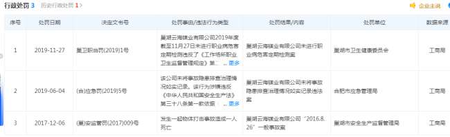 其中,星源卓镁与其第一大供应商巢湖云海镁业有限公司交易金额分别为959.08万元、1442.43万元和1862.08万元,占当期采购总额比例分别为28.78%、27.73%和30.09%。查公开资料显示,巢湖云海镁业有限公司曾受到行政处罚和环保处罚,据(巢)安监管罚(2017)009号显示,巢湖云海镁业有限公司发生一起物体打击事故造成一人死亡,受到行政处罚;据(合)应急罚(2019)5号文件显示,巢湖云海镁业有限公司因未将事故隐患排查治理情况如实记录受到处罚;巢湖云海镁业有限公司2019年度截至11月27日未进行职业病危害定期检测违反工作场所职业卫生监督管理规定,依法应当给予行政处罚建议立案调查,受到处罚;2014年曾因违反大气污染防治法,受到合肥市环境保护局罚款3万元,责令整改的处罚。
