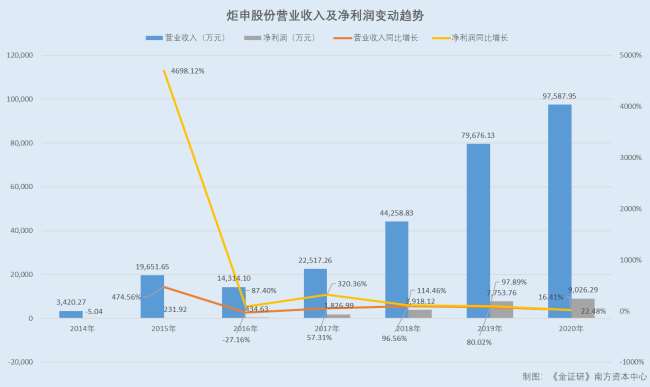 2014-2020年,炬申股份净利润分别为-5.04万元、231.92万元、434.63万元、1,826.99万元、3,918.12万元、7,753.76万元、9,026.29万元,2015-2020年分别同比增长4698.12%、87.4%、320.36%、114.46%、97.89%、16.41%。