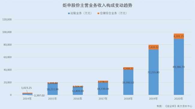 据新三板公开转让说明书、2017年年报、2020版招股书及招股书,2014-2020年,炬申股份运输业务营业收入分别为2,397.02万元、18,251.84万元、12,809.69万元、19,739.09万元、39,990.62万元、72,255.8万元、89,386.7万元,占同期主营业务收入比例分别为70.08%、92.88%、89.49%、87.66%、90.36%、90.69%、91.6%。