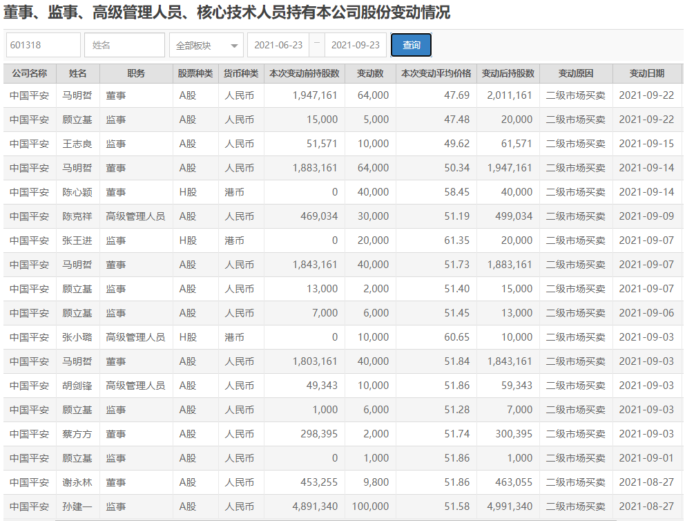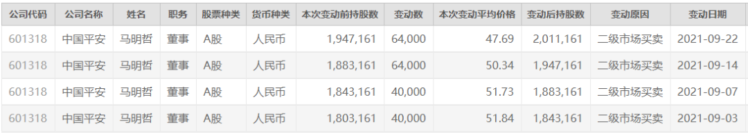 上海证券交易所最新披露的信息显示,中国平安董事长马明哲于9月22日以47.69元/股的平均价格再度增持6.4万股公司A股股票,耗资305.216万元。同日,中国平安监事顾立基以47.48元/股的平均价格增持5000股公司A股股票。
