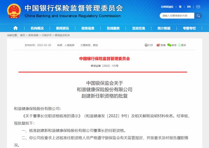 企迪网讯(编辑常威)近日,中国银保监会官网发布行政许可,核准赵建新(以下简称“和谐健康”)董事长的任职资格。