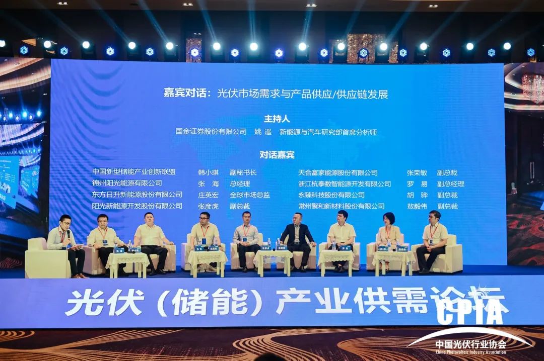 嘉宾对话环节由国金证券股份有限公司新能源与汽车研究部首席分析师 姚遥主持,中国新型储能产业创新联盟副秘书长韩小琪、锦州阳光能源有限公司总经理张海、东方日升新能源股份有限公司全球市场总监庄英宏、阳光新能源开发股份有限公司副总裁张彦虎、天合富家能源股份有限公司副总裁张荣敏、浙江杭泰数智能源开发有限公司副总经理罗易、永臻科技股份有限公司副总裁胡骅、常州聚和新材料股份有限公司副总裁敖毅伟参与对话。各位嘉宾就十四五”“十五五”市场空间、下半年光伏产业供需形势、光伏供应链各环节可能存在的瓶颈等问题进行了深入探讨。
