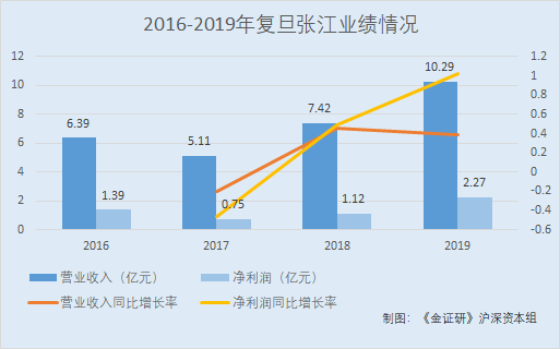 据招股书,2016-2019年及2020年一季度,复旦张江的营业收入分别为6.39亿元、5.11亿元、7.42亿元、10.29亿元、0.35亿元,2017-2019年分别同比增长-20.09%、45.29%、38.75%。