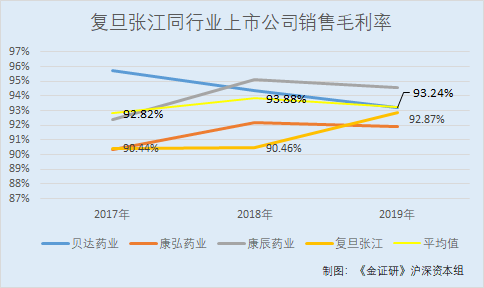 据同花顺iFinD数据,2017-2019年,复旦张江的销售毛利率分别为90.44%、90.46%、92.87%。