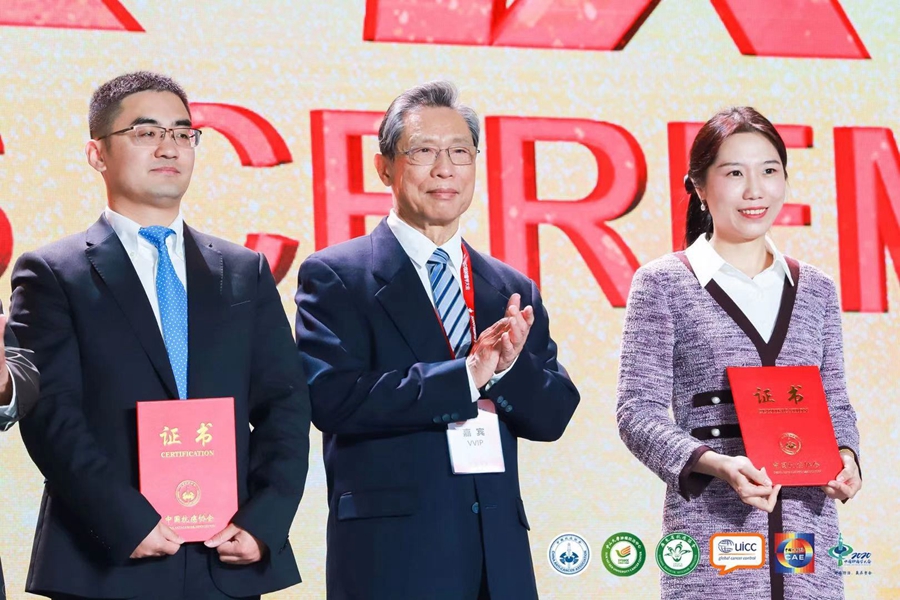 共和国勋章获得者钟南山院士为“中国肿瘤青年科学家奖”获得者颁奖