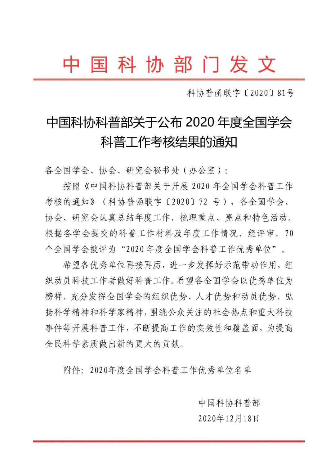 12月18日,中国科协科普部经过严格评审,正式发布了关于2020年度全国学会科普工作考核结果的通知。中国抗癌协会凭借本年度杰出的科普工作业绩荣获“2020年度全国学会科普工作优秀单位”。