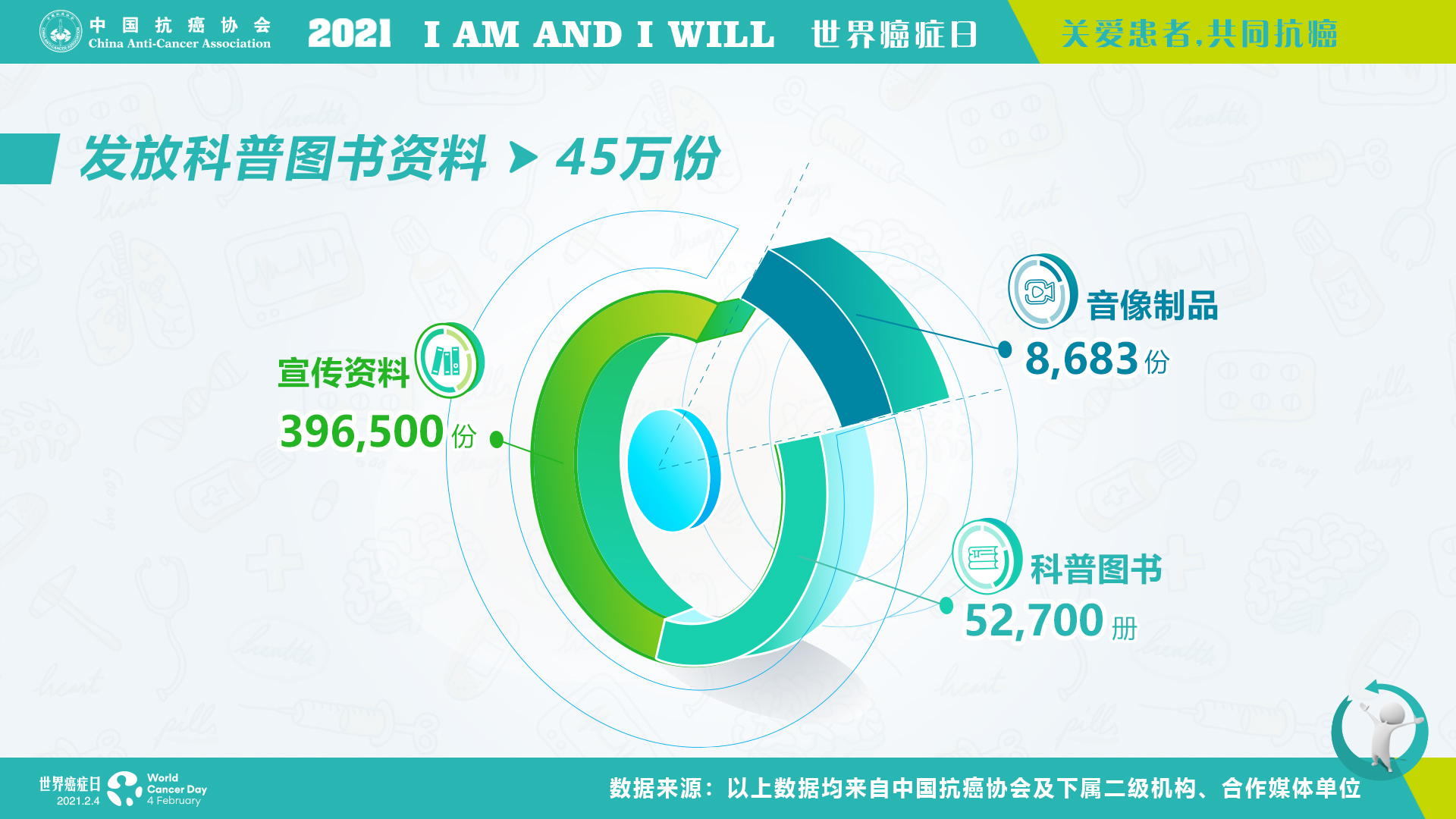 活动期间,各地在科普讲座、义诊咨询、医患互动等活动中,累计发放科普图书、宣传资料、音像制品等达到45万份,传播权威、实用的抗癌科普资讯,指导公众和患者科学抗癌。