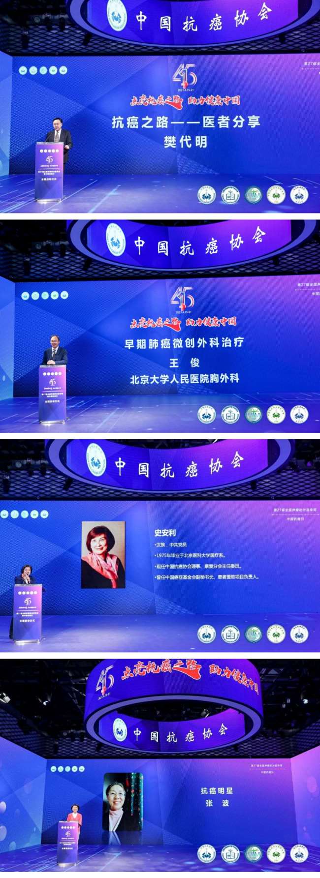 樊代明理事长和王俊院士分别做了《抗癌之路》医者故事分享,从医生视角,带来各自领域不同的防癌抗癌历程;在《抗癌之路》患者故事环节,中国抗癌协会康复分会主任委员、抗癌明星史安利教授和抗癌明星张波女士分介绍了他们身为多次复发癌症患者在癌症康复过程中秉持信念战胜癌症的破解之道,给患者信心,让公众放心。