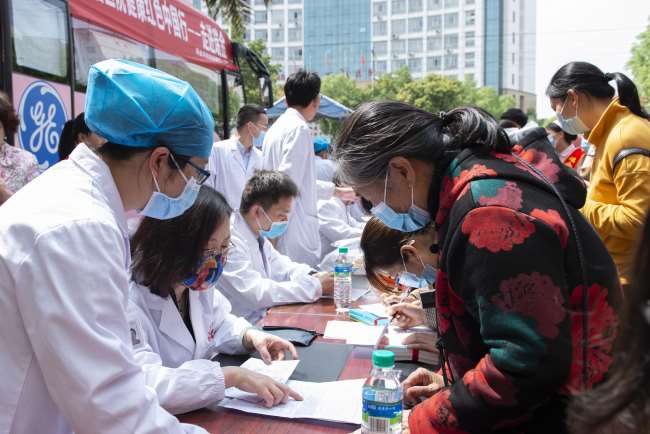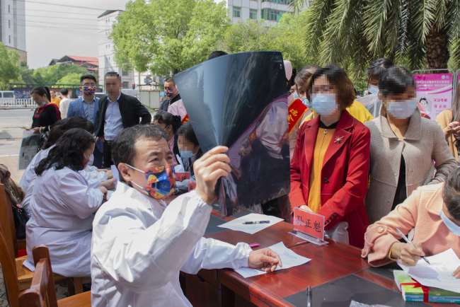 4月29日上午,本次系列活动之一,肿瘤名家义诊在瑞金市妇幼保健院爱婴楼前举行,来自天津医科大学肿瘤医院、江西省肿瘤医院、江西省妇幼保健院、南昌市第三医院、唐山市人民医院、河北大学附属医院等单位的10余位肿瘤专家,为闻讯而来的100余位患者提供了免费义诊、咨询、影像检查等服务,涉及妇科肿瘤、乳腺内科、乳腺外科、肿瘤影像、超声科专家等多学科,活动同时利用肿瘤筛查车为当地百姓进行义诊体检。通过问诊、检查、阅片、筛查车体检等方式,为当地百姓提供专业咨询服务,制定合理诊疗方案,获得广大基层患者和公众的热烈欢迎。