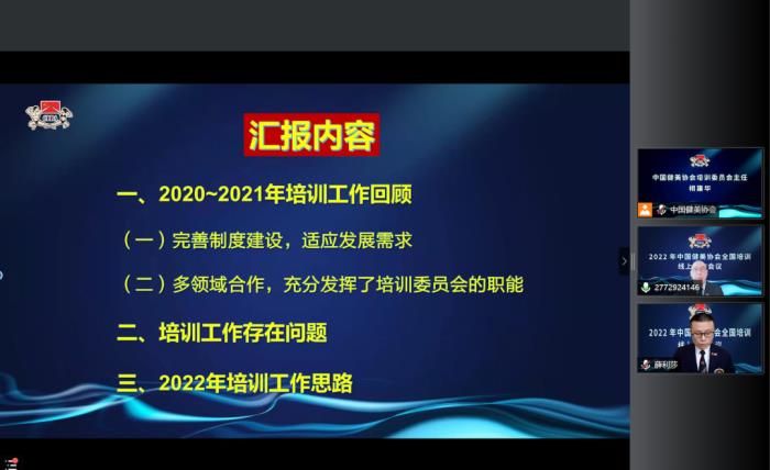 相建华从“完善制度建设,适应发展需求”和“多领域合作,充分发挥培训委员会的职能”两个方面对2020-2021年培训工作做了充分讲解,并总结了培训工作存在的问题。同时从“坚持把‘立德树人’作为中心环节”“坚持改革创新,践行‘四个回归’”“统一思想,按照中国健美协会颁布的工作标准开展培训业务”“搭建、完善线上培训系统”“严格培训教学管理和强化执行力度,规范教学秩序”“扩大各培训基地、各高校承办规模”等9个方面厘清了2022年的培训工作。