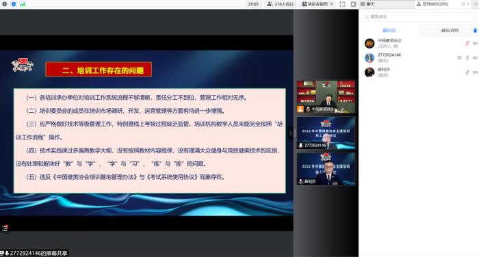 会议由中国健美协会常务副主席兼秘书长古桥主持,中国健美协会培训委员会主任相建华做中国健美协会专业技术人员培训工作报告,西美文化交流有限公司技术和客户主管薛利莎对中国健美协会培训网络系统的功能和用法做介绍。