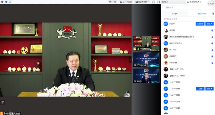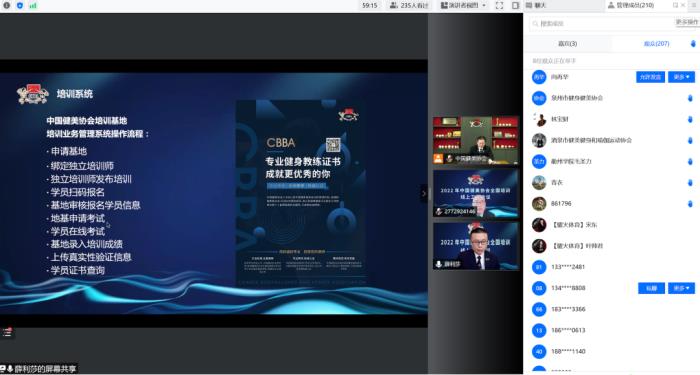 企迪网讯(编辑陈志强)3月8日上午10时,2022年中国健美协会全国培训线上工作会议顺利召开。本次会议有235人注册参会,其中:专业健身教练员培训基地133家(含青少幼体能培训,东方舞培训,体育模特培训),各地方协会44个。