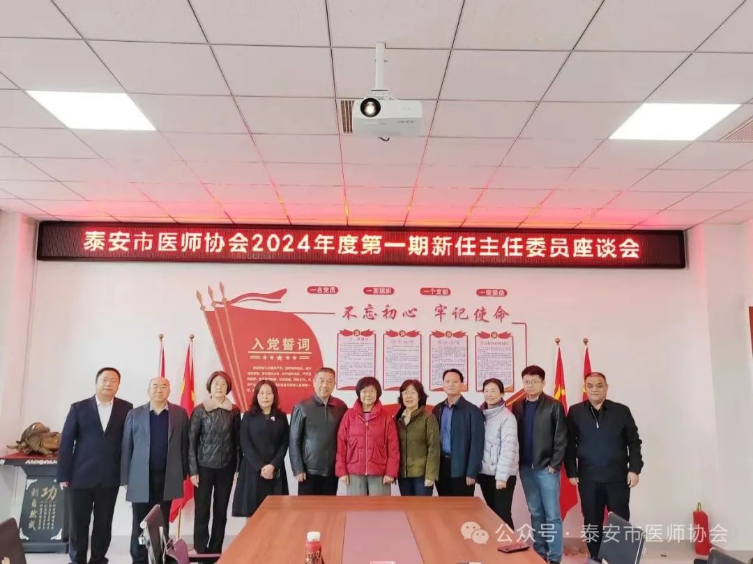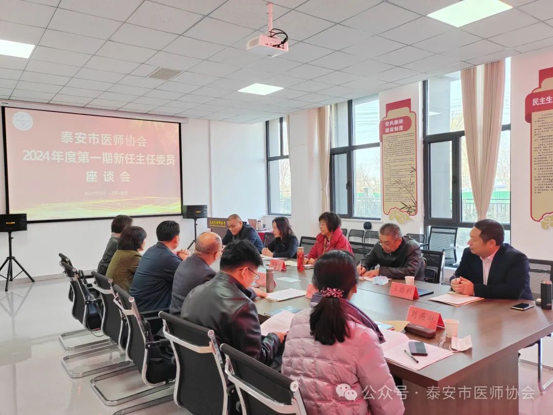 3月12日下午,泰安市医师协会2024年度第一期新任主任委员座谈会在协会会议室召开,市医师协会会长于爱莲,副会长李长勤,秘书长高明参加会议,近期新任的8位主任委员参加座谈。