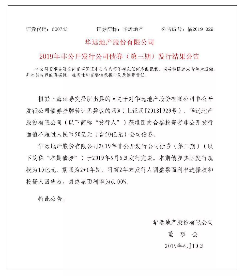 就在6月21日,华远地产非公开发行的2019年第三期公司债券正式在上交所挂牌,该期债券规模为10亿元,期限3年。此次发行是华远50亿公司债的最后一期。