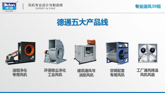 广东肇庆德通有限公司是设计、生产、销售通风设备的专业厂家,拥有30多年专业设计与制造风机的经验。德通产品主要涵盖环保除尘净化工业风机;建筑通风与消防风机;厨房油烟净化专用风机;空调配套风机;工厂通风降温风机、工业大吊扇、工业风扇、雾化风扇等领域。