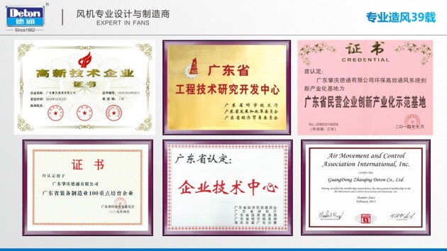 德通成立以来,坚持科技创新、高起点、高标准的宗旨,建立了完善的CAM生产加工系统,配备了高速光纤激光切割机、数控旋压机、数控冲床、数控折弯机、动平衡机、定子综合测试仪等专用设备,确保每个零件都得到精心制造。此外,为更好的分析产品测试数据,对产品进行研究开发,德通风机按美国AMCA210标准建立了气动性能自动检测系统,实现了从研发、检测、确保风机参数真实可靠的一站式制造流程。公司多项产品通过了CE、CB、ROHS、ERP、GS、UL、AMCA、SASO、SAA、S-mark、PAI、CCC等认证。目前,德通风机已具有开发和制造各类新型风机、工业风扇100万台的能力。