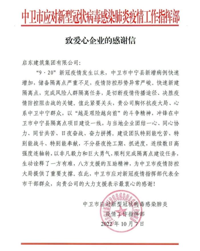 信中,抗疫指挥部对集团公司胸怀抗疫大局,心系中卫中宁群众,建设团队特别能吃苦、特别能战斗、特别能奉献的精神表示衷心感谢。