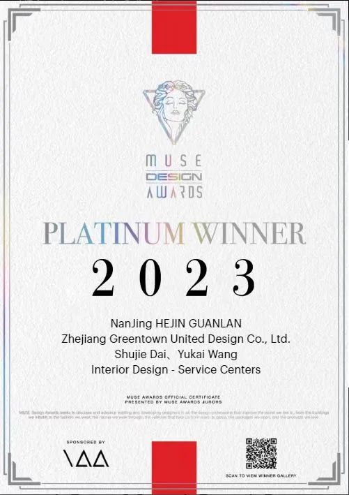 9月12日,绿城联合设计公司作品——绿城·南京合锦观澜售楼处,荣获2023美国MUSE缪斯设计“室内空间设计类”最高荣誉——铂金奖,这也是建筑科技集团设计业务斩获的第8个美国MUSE设计大奖。